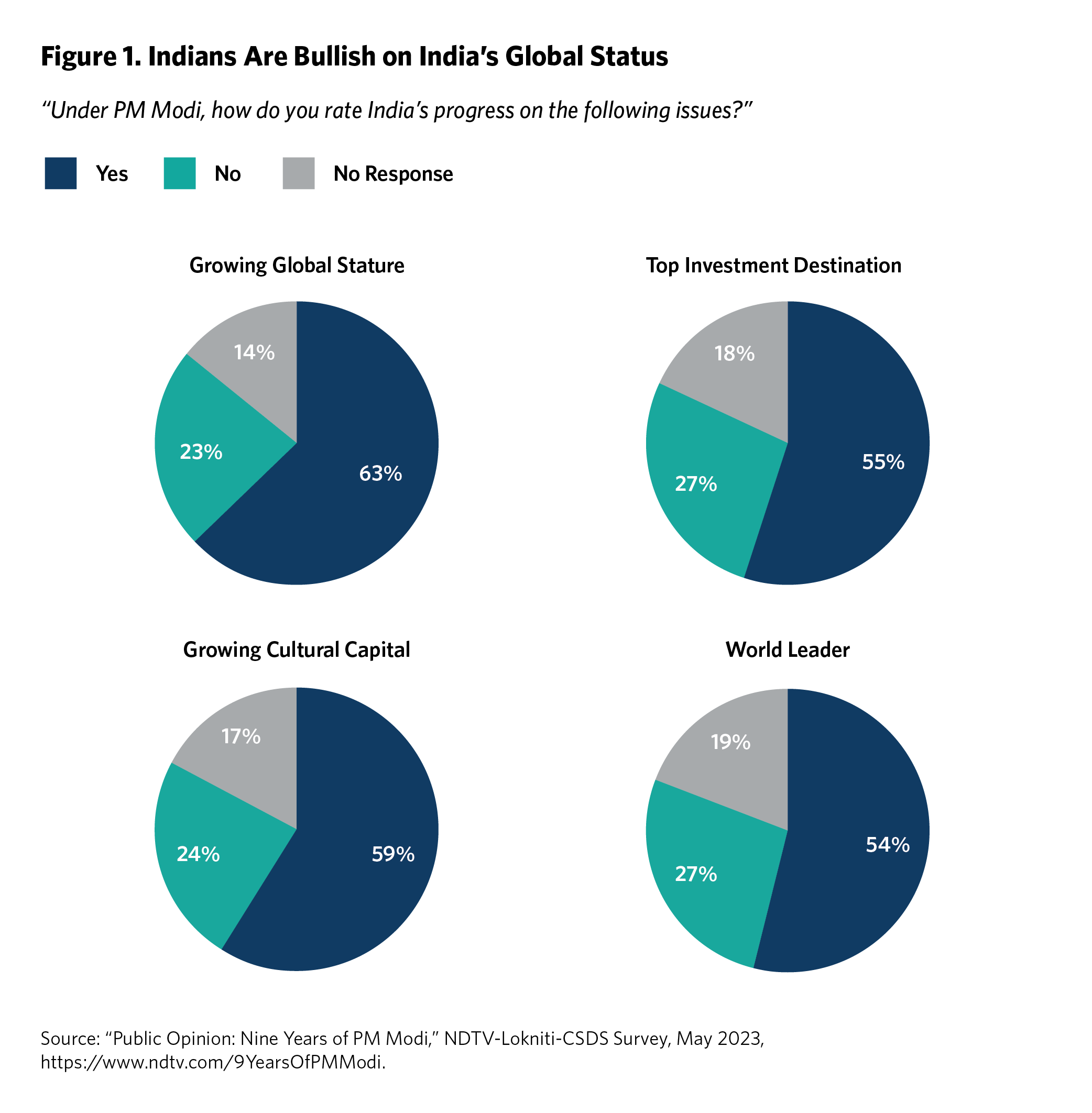 More systematic evidence also supports this contention. In a May 2023 nationally representative survey of Indians conducted by the Lokniti Programme of the Centre for the Study of Developing Societies (CSDS), in conjunction with NDTV, 63 percent of respondents reported that India’s global status had risen since Modi assumed office in 2014. The same poll found that most Indians believed the country had progressed in furthering its cultural capital, its status as a world leader, and its attraction as a destination for foreign investment during Modi’s tenure (see figure 1).